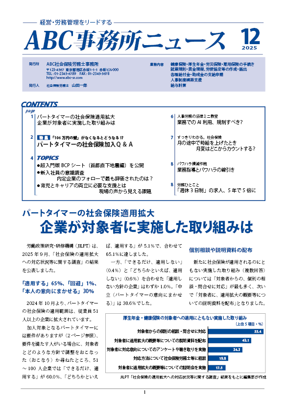 社会保険労務士の先生方が、それぞれの顧問先企業様へ自らを発行元とする「事務所ニュース」をお配り頂くように、当社が作成を代行し月1回ご提供します。
