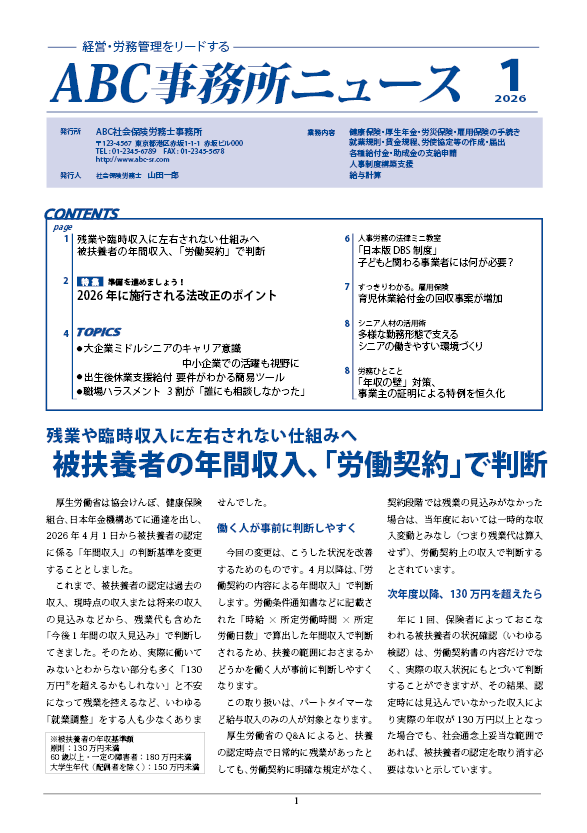 社会保険労務士の先生方が、それぞれの顧問先企業様へ自らを発行元とする「事務所ニュース」をお配り頂くように、当社が作成を代行し月1回ご提供します。